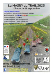 La Masny du Trail revient ce dimanche 28 septembre pour une nouvelle édition sportive, organisée par La Masny de Courir et inscrite au Challenge Run’Ostrevent 2025. Inscriptions : En ligne : https://la-masny-du-trail.adeorun.com Gratuit pour les participants inscrits au Challenge Run’Ostrevent (inscriptions sur https://bit.ly/3ziWcPF ou via la page Facebook du Challenge) Par flyer : à télécharger …