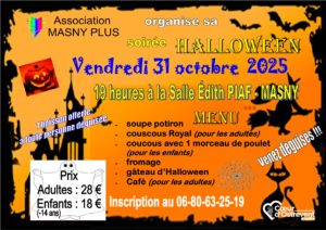 L’association Masny Plus vous invite à une soirée dansante spéciale Halloween, placée sous le signe de la convivialité, de la musique et de la fête. Déguisements bienvenus pour une ambiance encore plus réussie ! Au menu : Soupe de potiron Couscous royal Fromage Gâteau Café Tarifs : 28 € par adulte 18 € pour les …