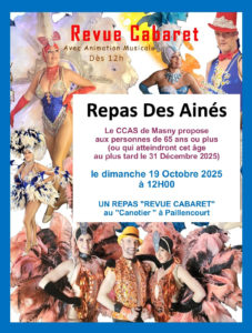 Le CCAS de Masny invite ses ainés à un repas dansant » Revue Cabaret » le 19 octobre 2025 à 12h00 au Canotier à Paillencourt. Les masnysiens de 65 ans ou plus (ou qui atteindront cet âge au plus tard le 31 Décembre 2025) peuvent s’inscrire auprès du CCAS ou en mairie à compter du 15 …